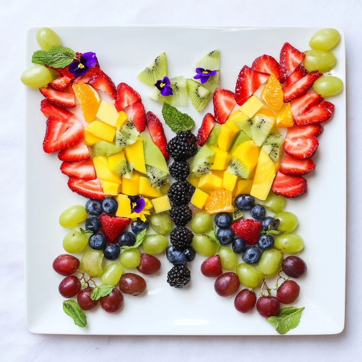 Save A vibrant and whimsical fruit platter arranged in the shape of a butterfly, perfect for parties, brunches, or special occasions. Fresh, colorful fruits are artfully displayed to create an eye-catching edible centerpiece.