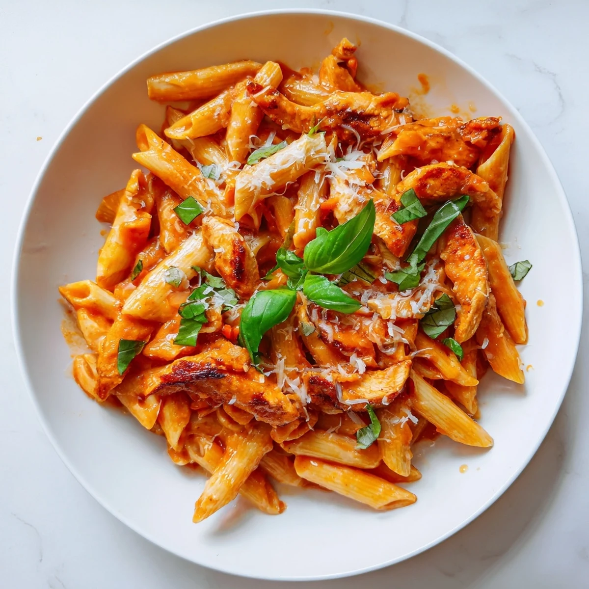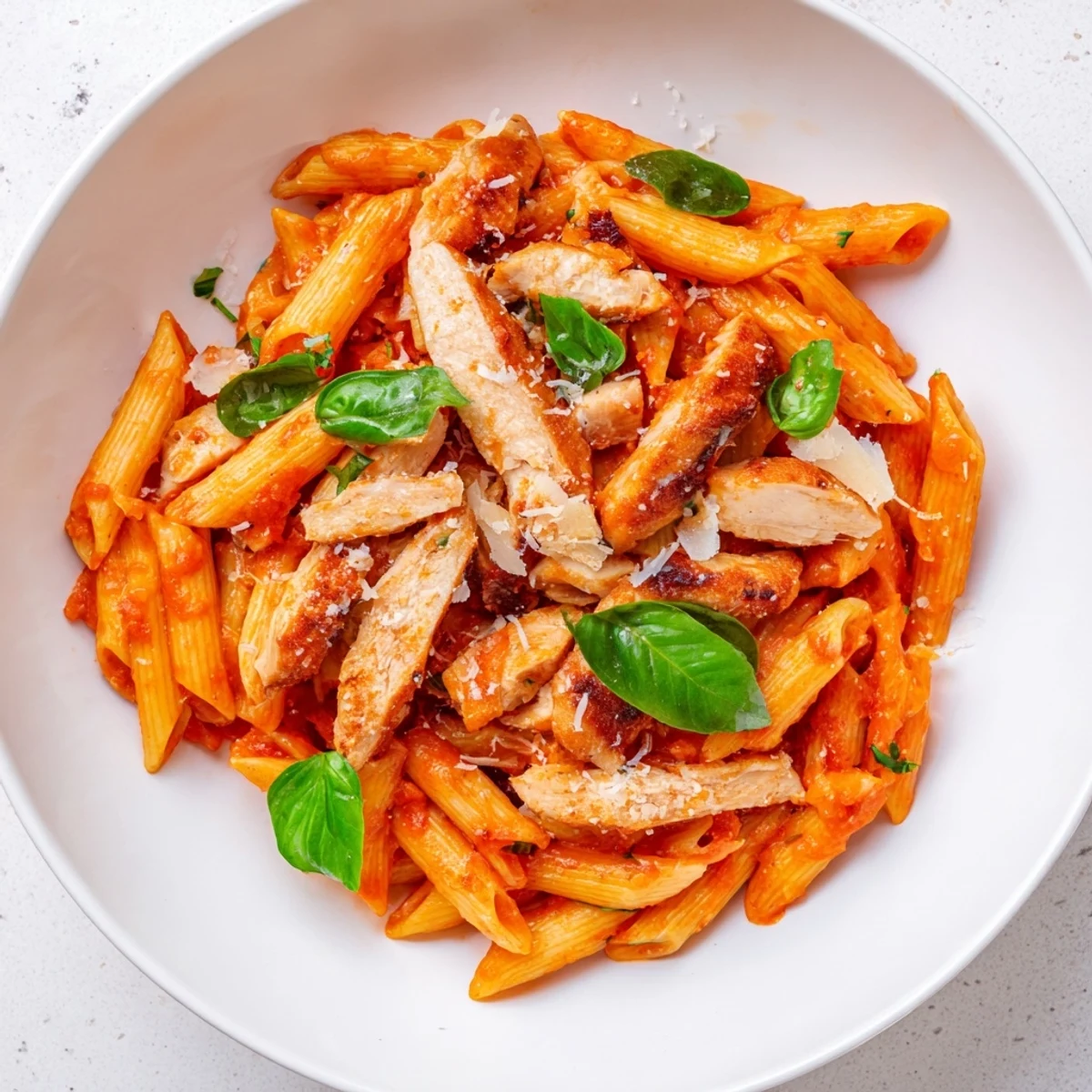 - Add the drained penne directly into the sauce and toss until every piece is coated and glossy. Top with sliced chicken, a scattering of basil, and Parmesan if you're using it.