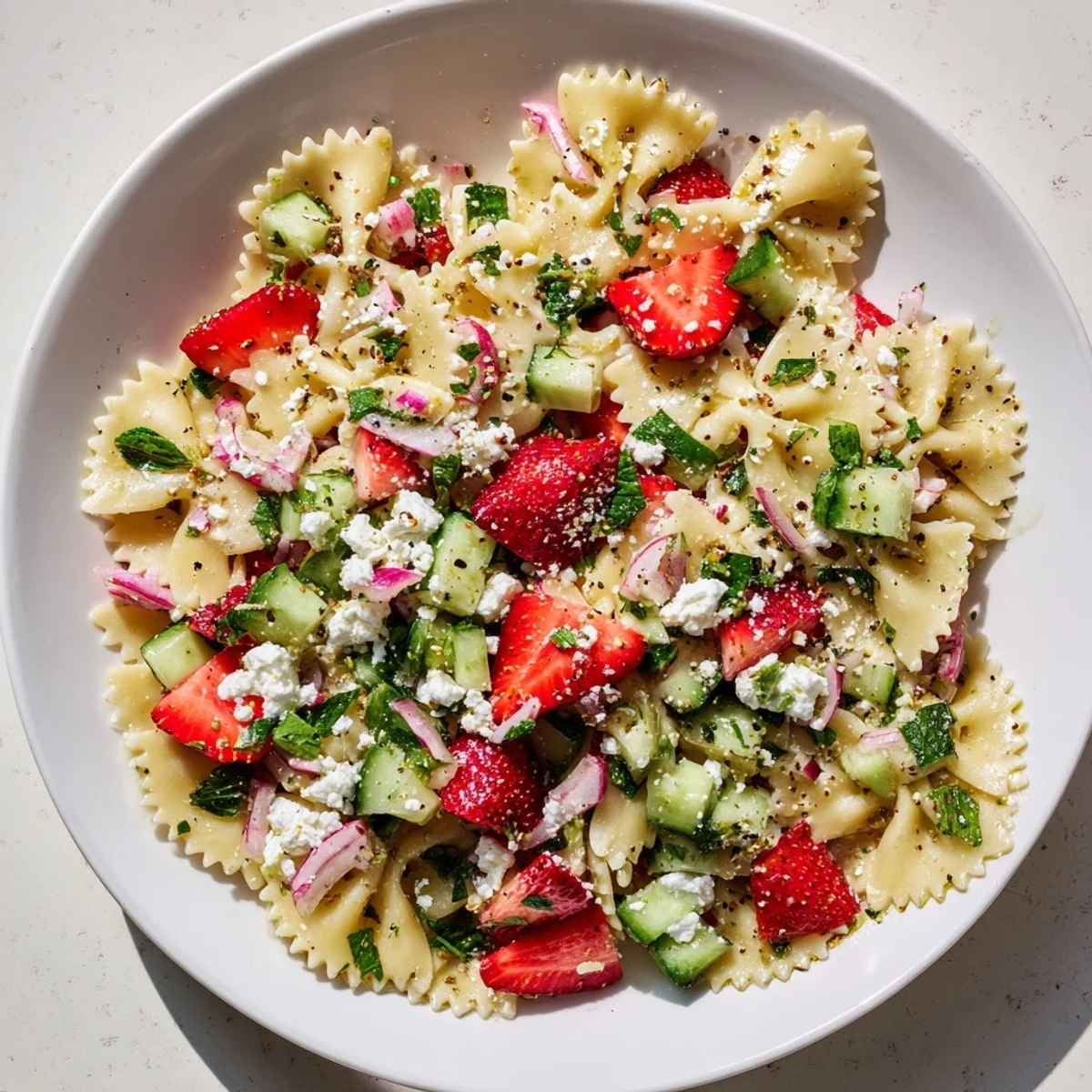 - Add the cooled pasta to the salad bowl, then pour the dressing over everything and toss with a light hand, using a fork and spoon to coat everything evenly without crushing the strawberries or feta. The pasta should glisten but not look soggy.