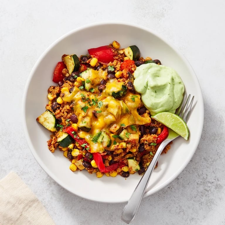Save A vibrant one-pan Tex-Mex main dish packed with colorful vegetables black beans and classic spices all finished with a creamy avocado yogurt sauce. Ideal for busy weeknights this skillet dinner comes together quickly and delivers hearty flavor with fresh toppings to suit any taste.