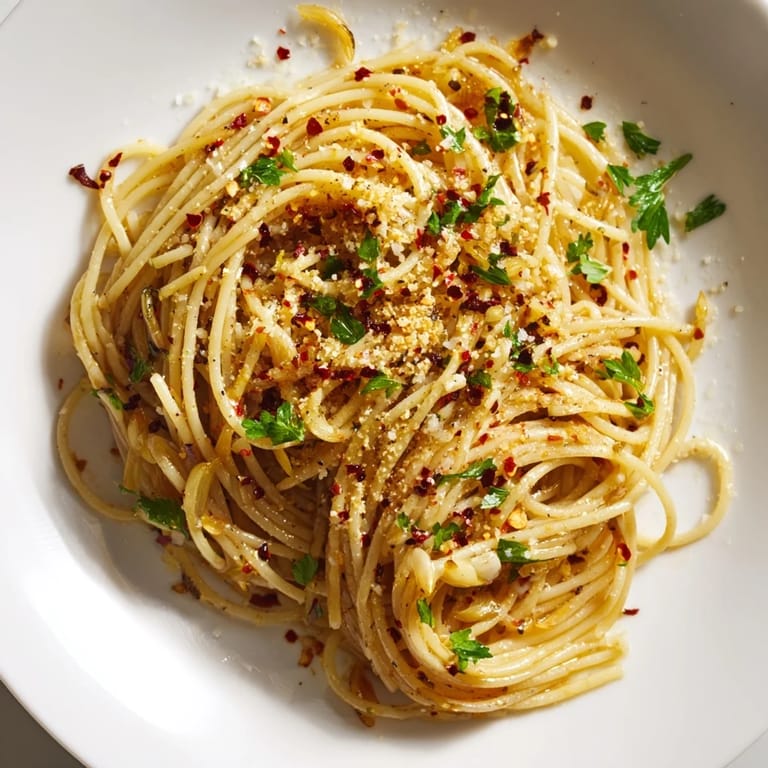This simple Italian pasta highlights spaghetti gently coated in garlic-infused olive oil, spiced with red chili flakes for a subtle heat. Cooked in just 10 minutes, the dish is finished with chopped fresh parsley and an optional sprinkle of Parmesan cheese. The method emphasizes quick sautéing of garlic until golden, careful seasoning, and the gentle tossing of pasta to absorb flavors. Perfect for those seeking a light and speedy meal with a savory, aromatic profile.