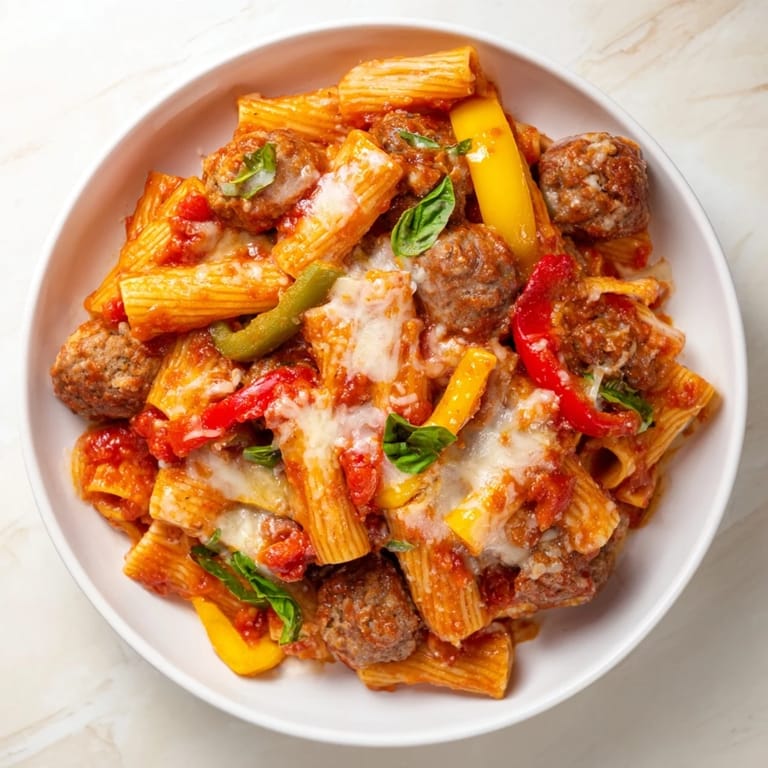 Save A hearty Italian-American casserole featuring rigatoni pasta, savory sausage, sweet bell peppers, and a rich tomato sauce, all baked under a blanket of melted cheese.