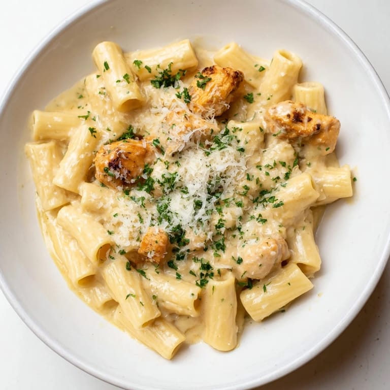 Save A comforting pasta dish featuring tender chicken, a rich garlic-Parmesan cream sauce, and perfectly cooked rigatoni. Ideal for a cozy weeknight meal or entertaining guests.