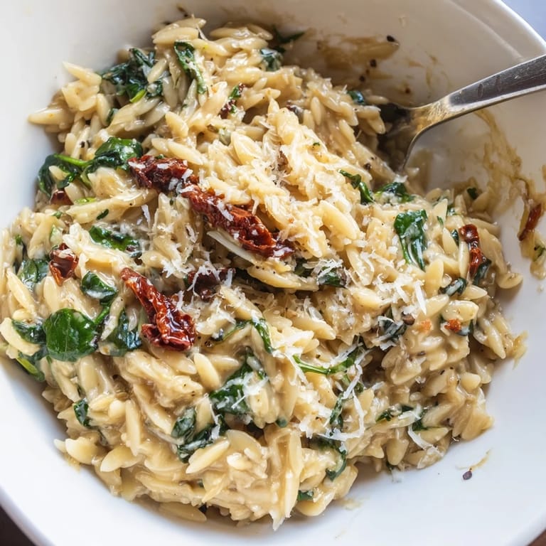 Save A rich and comforting bowl of orzo pasta, simmered in a creamy garlic-Parmesan sauce with sun-dried tomatoes, spinach, and a hint of Italian herbs. Perfect for a satisfying vegetarian meal.