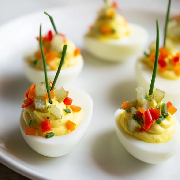 These festive deviled egg ornaments add a playful holiday twist to a classic appetizer. Hard-boiled eggs are halved and filled with a creamy blend of mayonnaise, Dijon mustard, vinegar, and seasonings. The egg tops are decorated with finely diced red and green bell peppers, carrots, chives, and optional pickles, creating vibrant, colorful ornament shapes. Each egg features a chive or parsley stem to mimic ornament hangers. Ready in just 30 minutes, they make a cheerful addition to any celebration table.