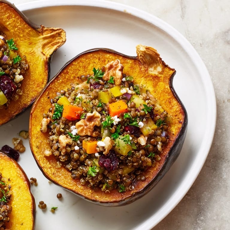 Save A hearty, flavorful dish featuring acorn squash halves filled with a savory mixture of lentils, walnuts, vegetables, and herbs. Perfect as a vegetarian main or festive side.