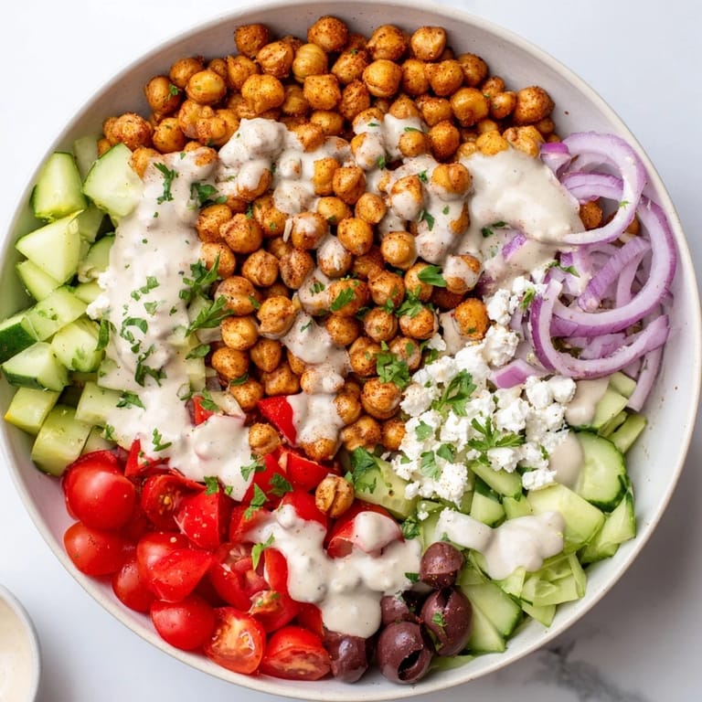 This Mediterranean Chickpea Bowl features spiced roasted chickpeas paired with fresh cherry tomatoes, cucumber, red onion, bell pepper, olives, and parsley. A smooth tahini dressing ties the bowl together with a hint of lemon and garlic. Optionally layered over quinoa or brown rice, it provides a balanced, satisfying meal that's both hearty and refreshing. Perfectly seasoned and quick to prepare, this vibrant bowl suits vegetarian and vegan diets alike.