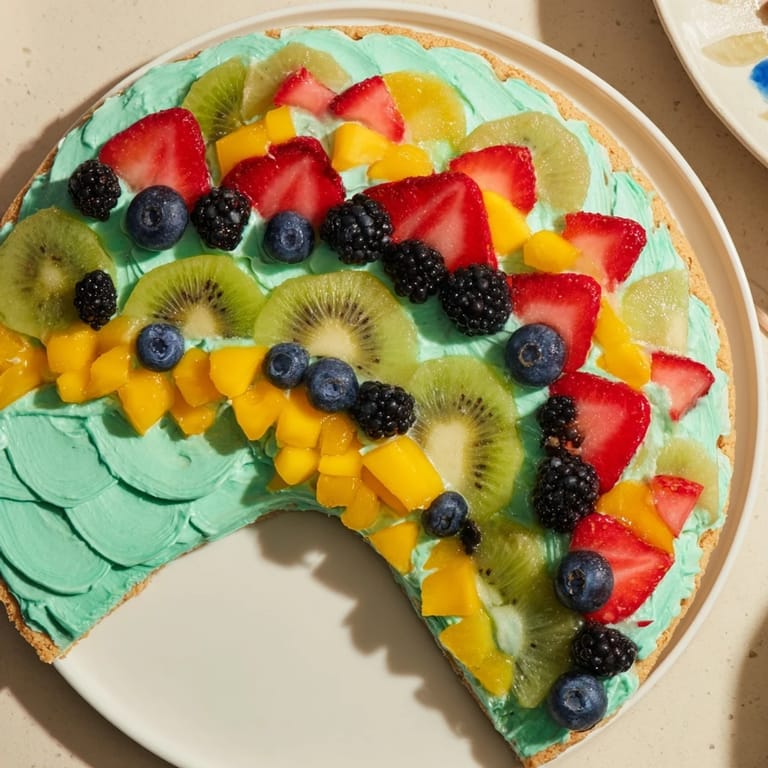 Save A whimsical and colorful dessert pizza featuring a sugar cookie crust topped with a creamy frosting and an array of vibrant fresh fruit arranged in a beautiful mermaid tail patternβperfect for parties or themed celebrations.