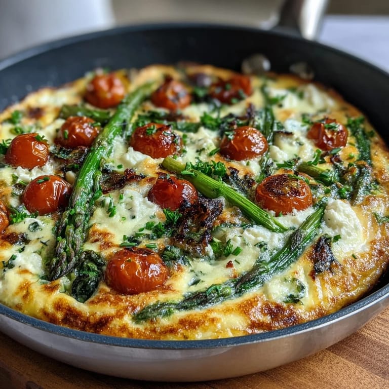 This light spring frittata blends tender asparagus, baby spinach, zucchini, and cherry tomatoes with creamy goat cheese and Parmesan. Fresh herbs like chives and parsley add an aromatic touch. After sautéing the veggies in olive oil, eggs combined with milk and seasoning create a fluffy base. The skillet bakes until puffed and golden, resulting in a flavorful dish perfect for brunch or a quick dinner. Variations can include peas or artichokes, and it pairs well with greens or crusty bread.