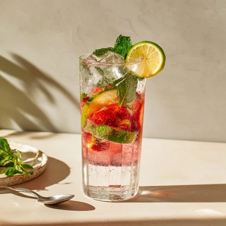 Incorporate Fresh Elements: Add sliced lemon, lime, fresh strawberries, mint leaves, and cucumber to the mixture.